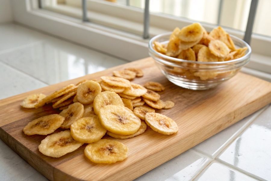 Kluczem do perfekcyjnych chipsów bananowych jest cierpliwość podczas suszenia. Proces może trwać od 6 do 12 godzin w suszarce lub 2-3 godziny w piekarniku, w zależności od grubości plastrów i zawartości wody w owocach.