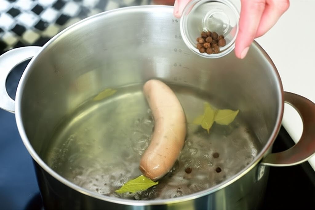 Ugotuj wstępnie kiełbasy w 650 mililitrach wody z dodatkiem liścia laurowego i ziela angielskiego.