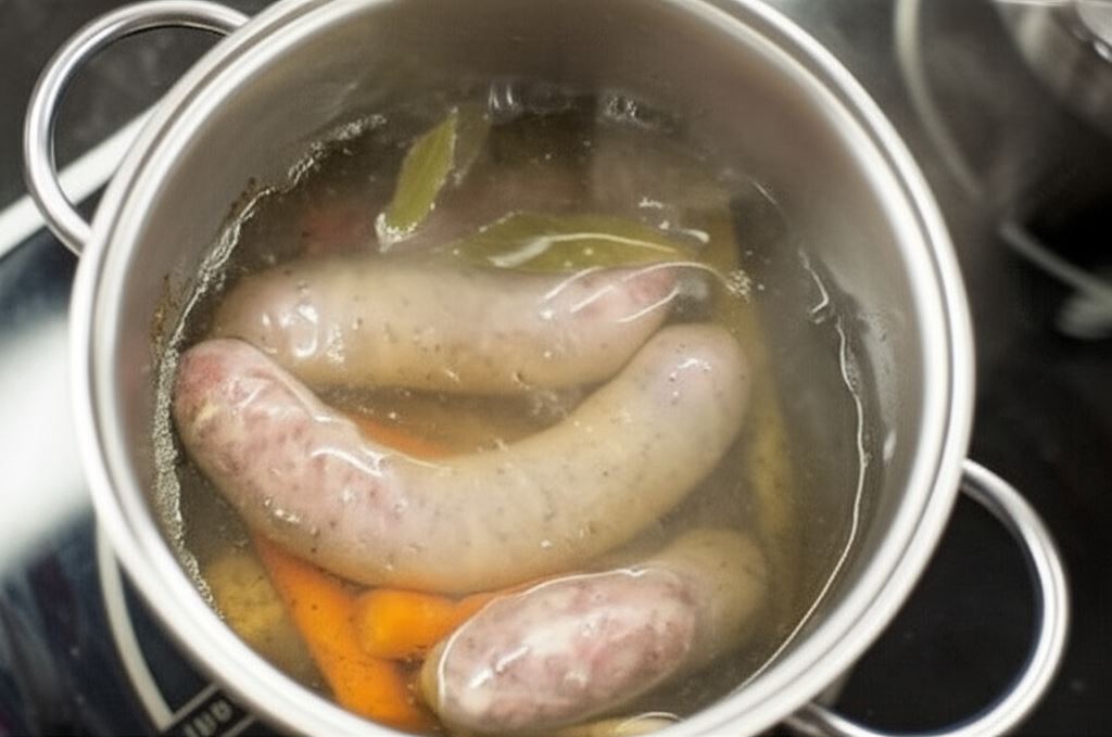 Umieść białą kiełbasę w gotującym się wywarze. Gotuj na małym ogniu przez około 20 minut, potem przenieś na talerz.