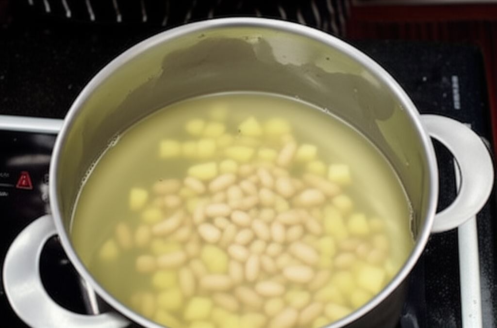 Do wywaru wrzuć pokrojone ziemniaki. Kiedy staną się miękkie, dodaj białą fasolę.