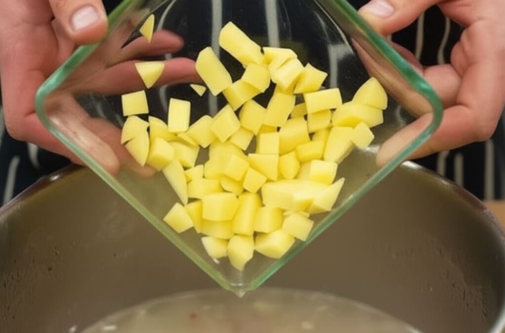 W garnku zrumień cebulę z kurczakiem, potem dolej 800 ml zimnej wody. Wsyp ziemniaki i gotuj wszystko do momentu, aż ziemniaki zmiękną.