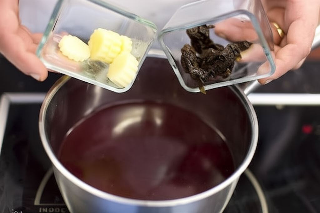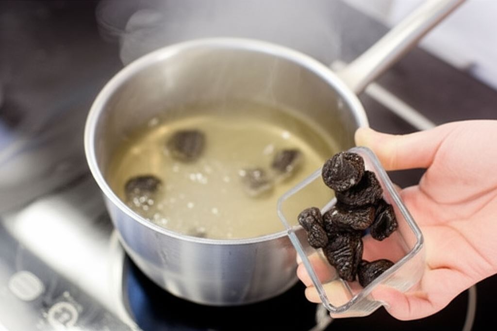 Gotuj suszone śliwki przez 5 minut w 4 szklankach wody z otartą skórką cytrynową, goździkami i pieprzem.
