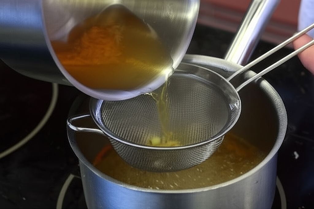 Potem przefiltruj wywar. Podgrzej go silnie, a następnie odsuń z ognia.