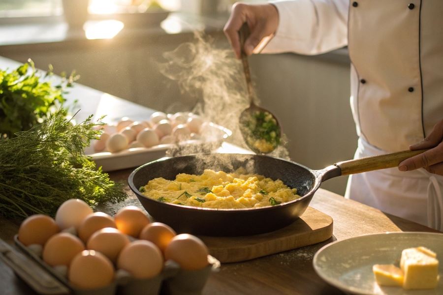 Sekret idealnej jajecznicy: używaj ceramicznej lub teflonowej patelni, która równomiernie rozprowadza ciepło i zapobiega przywieraniu.