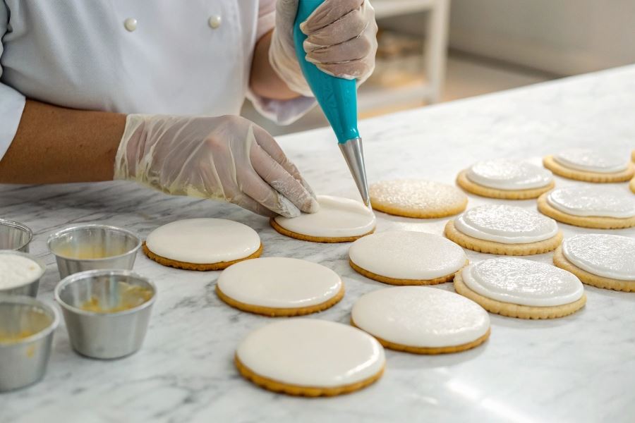 Temperatura wypieków ma kluczowe znaczenie – lukier należy nakładać na całkowicie wystudzone wypieki (minimum 2 godziny po wypieku). Ciepłe ciasto powoduje zbyt szybkie wchłanianie wilgoci z lukru, co skutkuje matową powierzchnią.