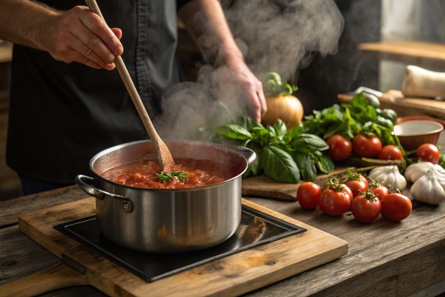• Utrzymuj delikatne wrzenie, nigdy gwałtowne – zbyt wysoka temperatura może przypalić sos