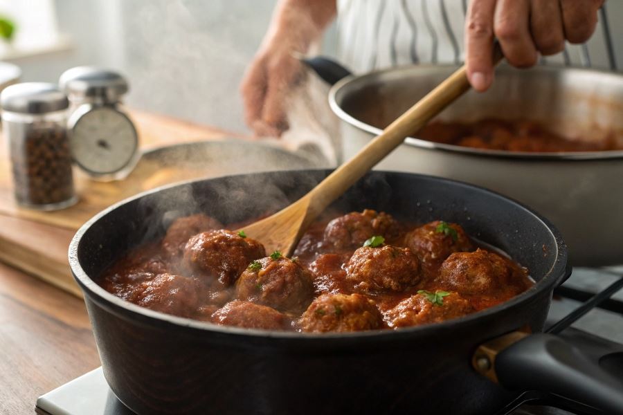 Duszenie na wolnym ogniu (75-85°C) przez 30-40 minut pozwala na głębokie przeniknięcie smaków i zachowanie soczystości pulpetów. Szybkie duszenie (90-95°C) skraca czas do 15-25 minut, ale wymaga częstszego mieszania i kontroli, by uniknąć przypalenia.
