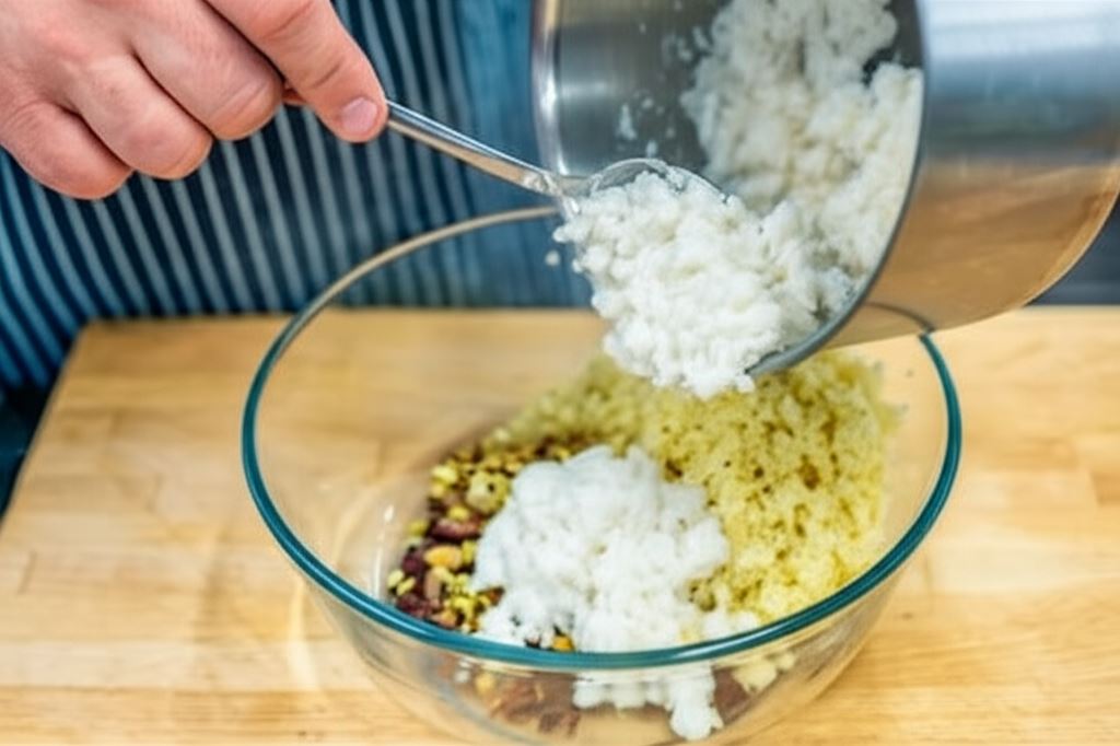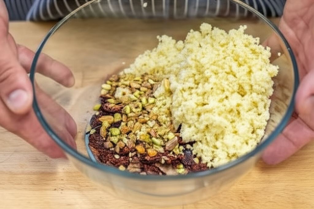Rozdrobnij maliny i orzechy pistacjowe do miski.