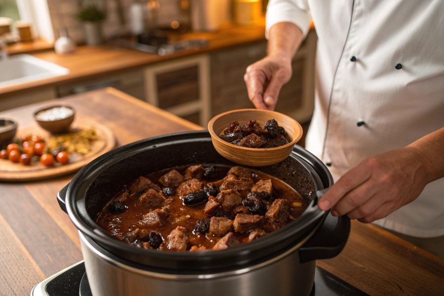 Sekret idealnej wołowiny z suszonymi śliwkami tkwi w powolnym gotowaniu na niskiej temperaturze, co pozwala mięsu stać się miękkim i soczystym, a śliwkom oddać swój słodki aromat.