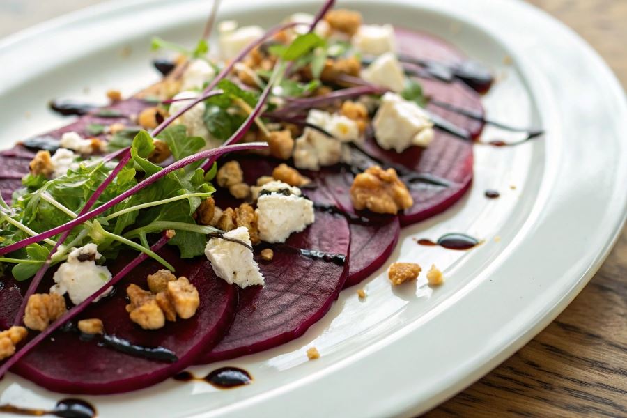 Na eleganckich przyjęciach carpaccio z buraka można podać z delikatnym sosem balsamicznym lub redukcją z octu jabłkowego i miodu. Doskonale komponuje się również z płatkami parmezanu, kozim serem lub ricottą, tworząc harmonijne połączenie słodkawego buraka z wyrazistym, lekko słonym serem.