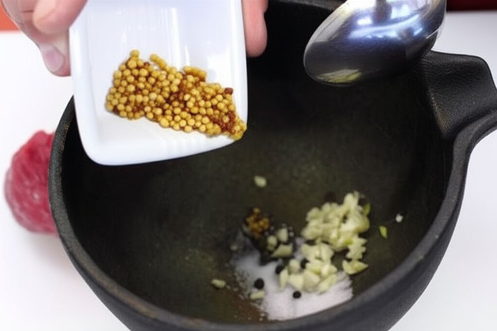 Sporządź marynatę. W moździerzu połącz sól, pieprz w ziarnach, gorczycę, czosnek oraz oliwę.