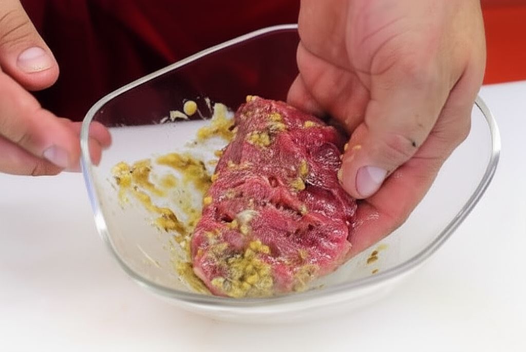Polędwicę oczyść. Przygotuj befsztyki o masie około 100 gramów. Umieść w sporządzonej marynacie.