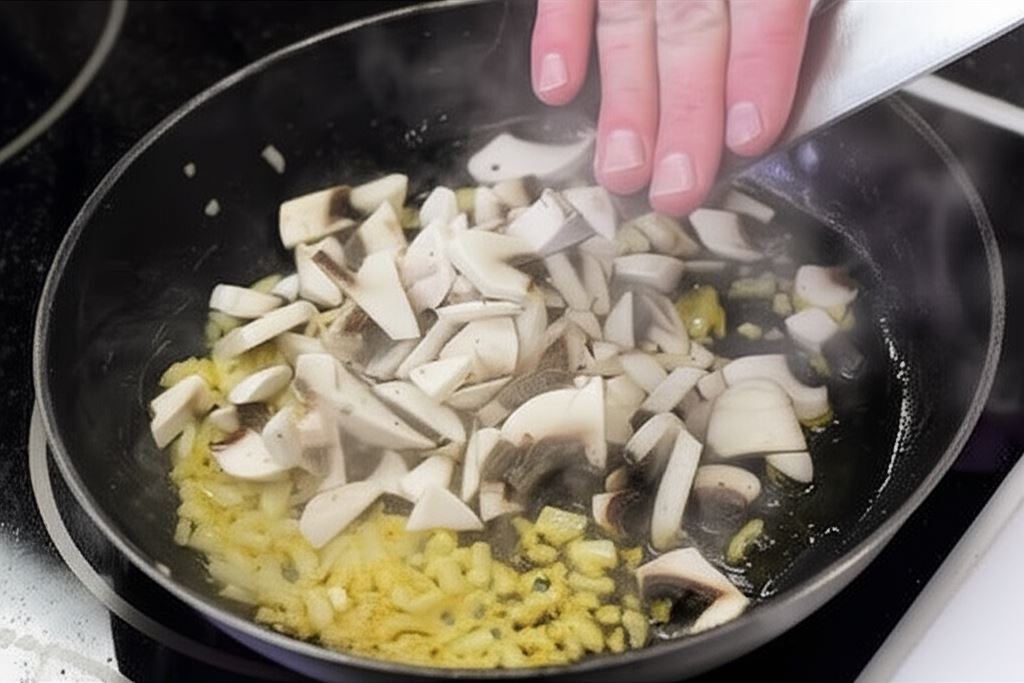 Pieczarki oczyść i posiekaj drobno. Zeszklij cebulę pokrojoną w kostkę. Dodaj pieczarki i smaż, aż zmiękną i odparuje cała powstała ciecz.