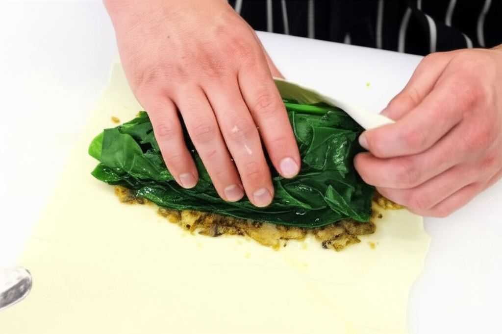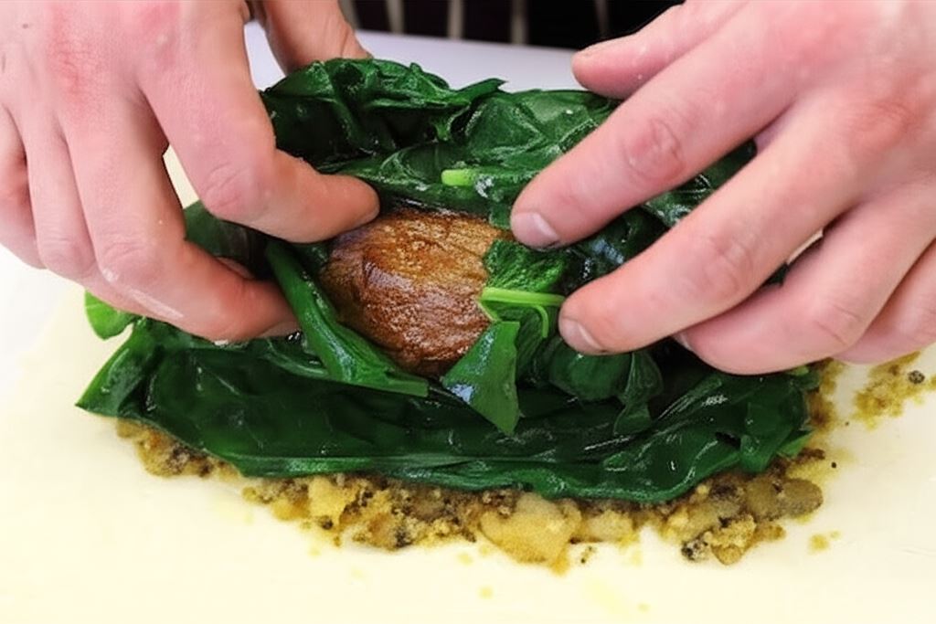 Szpinak zalej wrzącą wodą, liśćmi owiń polędwicę.