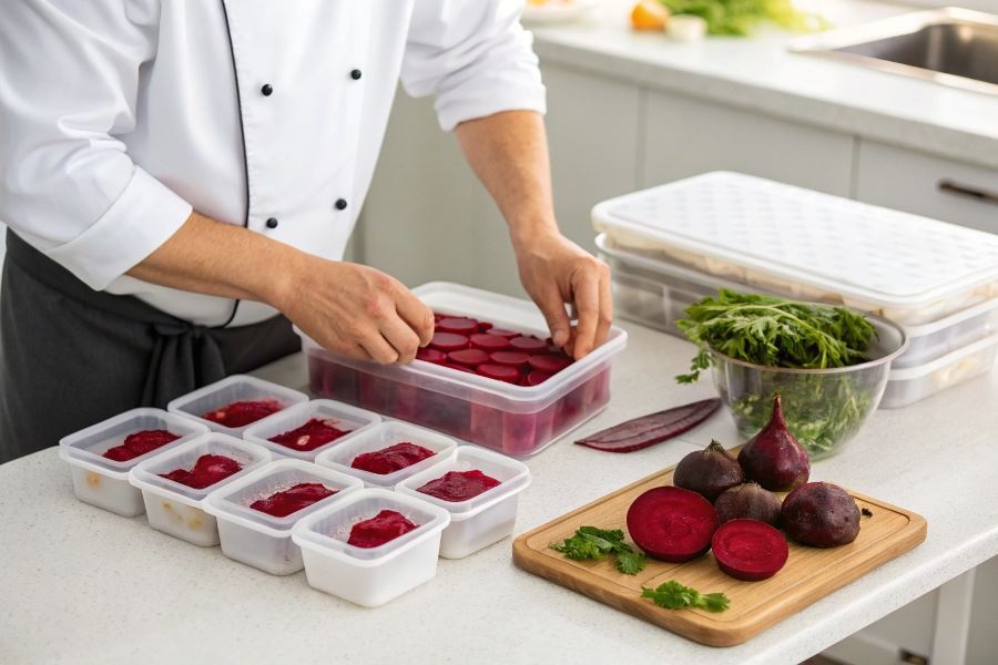 • Gotowanie – ugotowanie buraków do stanu al dente (lekko twardego) przed zamrożeniem zapewnia lepszą teksturę po rozmrożeniu.