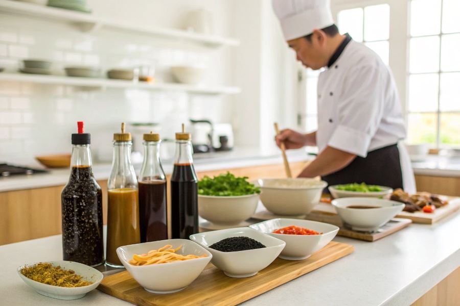Sos ostrygowy łączy w sobie słodycz i słoność z nutą morskiego umami, co czyni go doskonałym zamiennikiem w daniach azjatyckich. Jest nieco gęstszy od sosu rybnego, więc warto rozcieńczyć go odrobiną wody przed użyciem. Szczególnie dobrze komponuje się z: