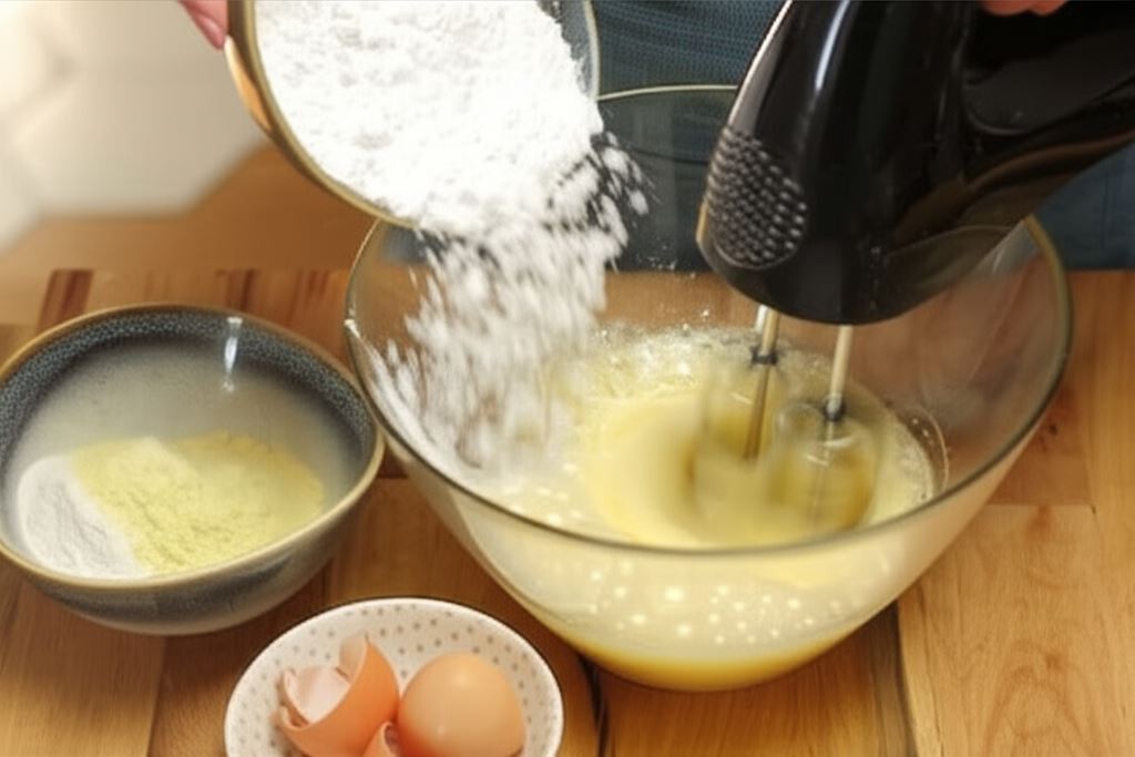 W naczyniu połącz obydwie mąki i sól. Jajka delikatnie roztrzep z cukrem pudrem.