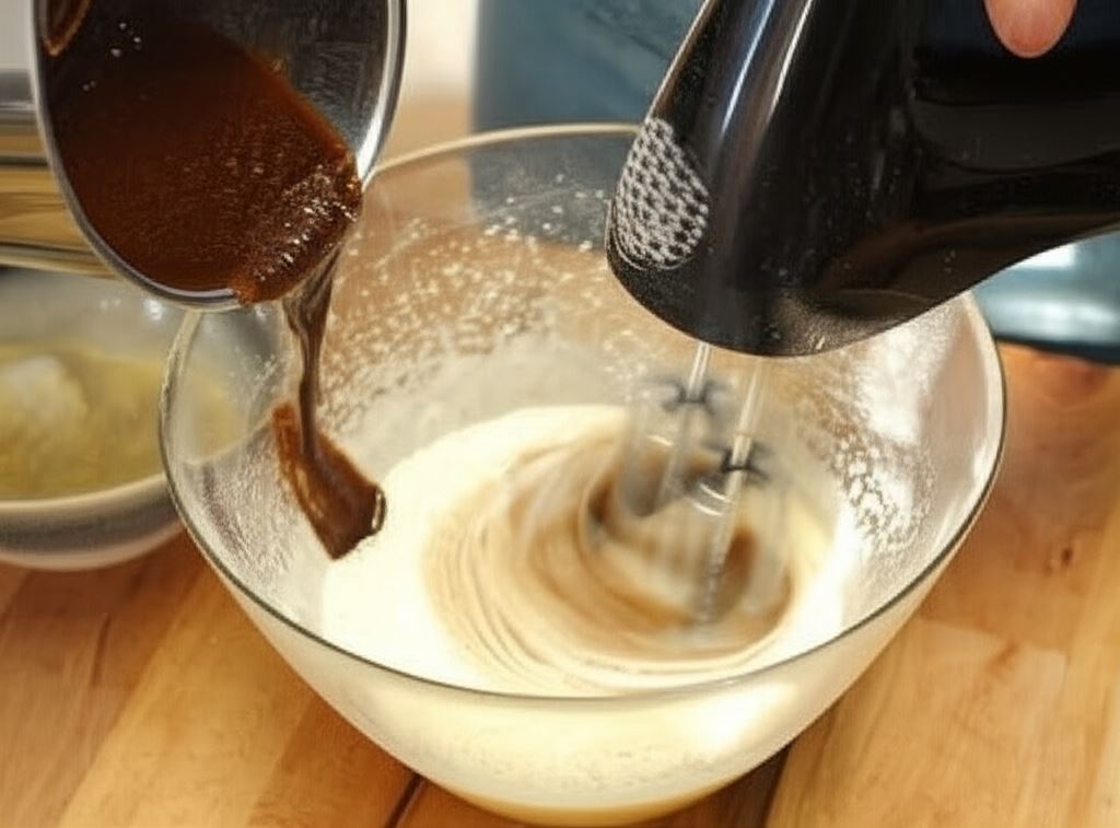 Do masy z jaj wsyp przygotowaną masę z czekolady i zmieszaj przy użyciu miksera.