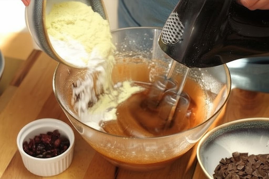 Potem ciągle mieszając, wsyp mieszankę mąk, pozostałą 1/3 część czekolady i suszoną żurawinę.