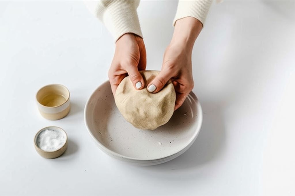 W naczyniu łączymy mąkę ryżową z mąką ziemniaczaną i siemieniem lnianym. Wlewamy olej. Dolewamy ciepłą wodę i delikatnie mieszamy. Ciasto powinno być elastyczne i gładkie. Tworzymy z niego kulę i okrywamy folią spożywczą.