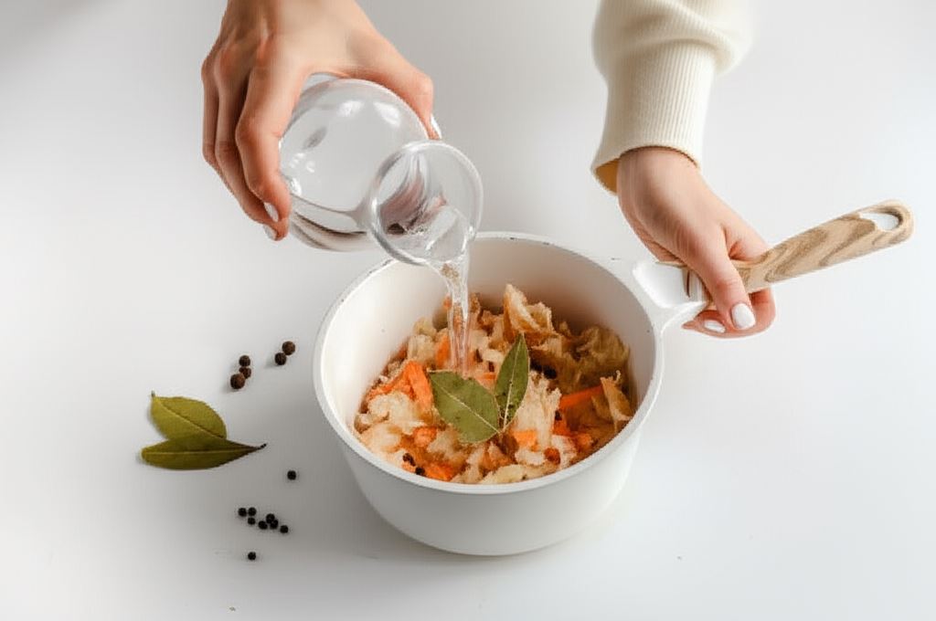 Kapustę kiszoną przepłukujemy na sitku. Umieszczamy w garnku. Wsypujemy liście laurowe, ziele angielskie i pieprz czarny. Zalewamy wodą i gotujemy aż zmięknie około 30-40 min. Następnie odcedzamy i siekamy drobno.