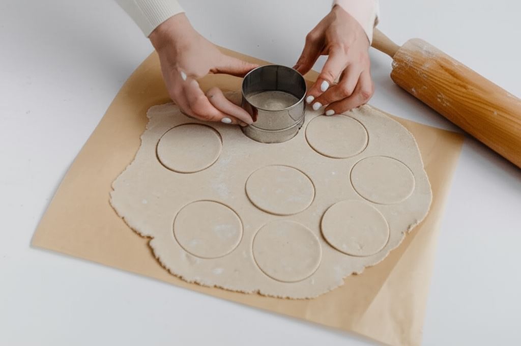 Ciasto wałkujemy na płaski, cienki krążek. Przy użyciu szklanki lub metalowych foremek wycinamy okrągłe kształty.