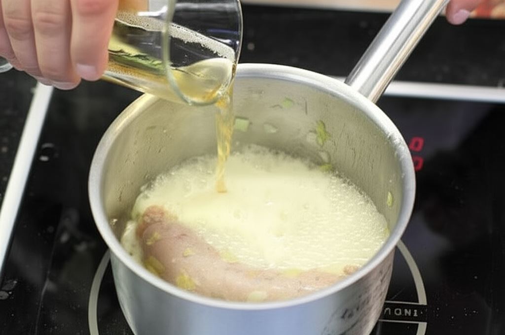 Dodaj piwo do rondla z kiełbasą i doprowadź do wrzenia.