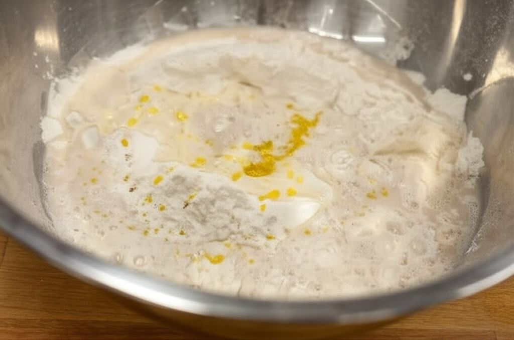 Rozpocznij przygotowanie pizzy carbonara od wsypania wszystkich składników na ciasto do dużej miski: mąki pszennej, drożdży, soli, cukru, oraz wody i oliwy z oliwek lub oleju roślinnego. Połącz składniki i starannie wyrób rękami. Ciasto powinno być sprężyste i bez grudek mąki. Następnie nakryj miskę z ciastem lnianą ściereczką i odstaw w ciepłe miejsce na 40 minut. W tym czasie ciasto powinno urosnąć.