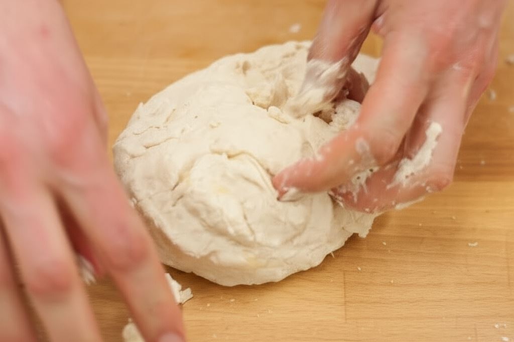 Po 40 minutach odkryj ciasto i ponownie wyrób je dłonią. Jeśli przywiera do twoich rąk, możesz posypać je niewielką ilością mąki. Potem podziel ciasto na 4-6 części o zbliżonej wielkości i uformuj z nich kulki.