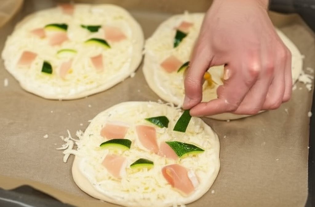 Potem pokrój cebulę i cukinię na plastry. Posyp placki pizzowe tartą mozzarellą, rozłóż plastry boczku, pokrojoną cebulę i cukinię.