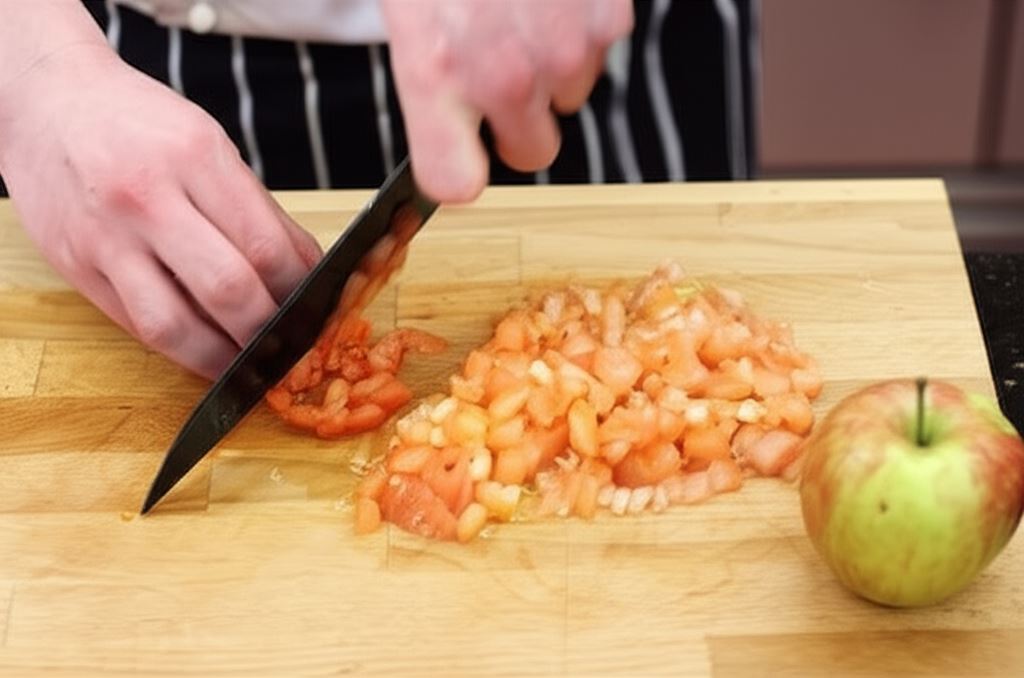 Pomidory zdejmij skórkę, posiekaj. Jabłka obierz i utrzyj na tarce, wsyp oba składniki do kapusty.