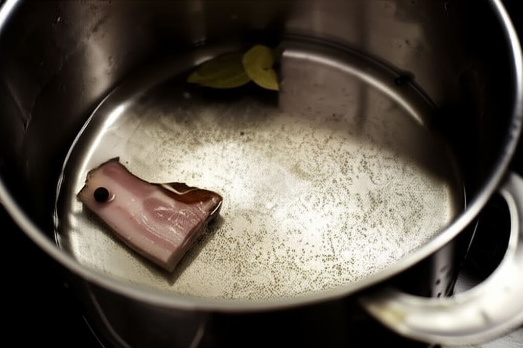 Ugotuj wędzony boczek w wodzie z dodatkiem liścia laurowego i ziela angielskiego, a następnie pokrój go w kostkę.