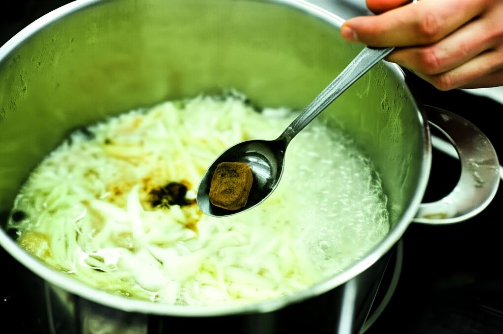 Do wywaru z boczku wsyp poszatkowaną kapustę kiszoną i białą. Dodaj kostki Knorr i gotuj przez około 30 minut.