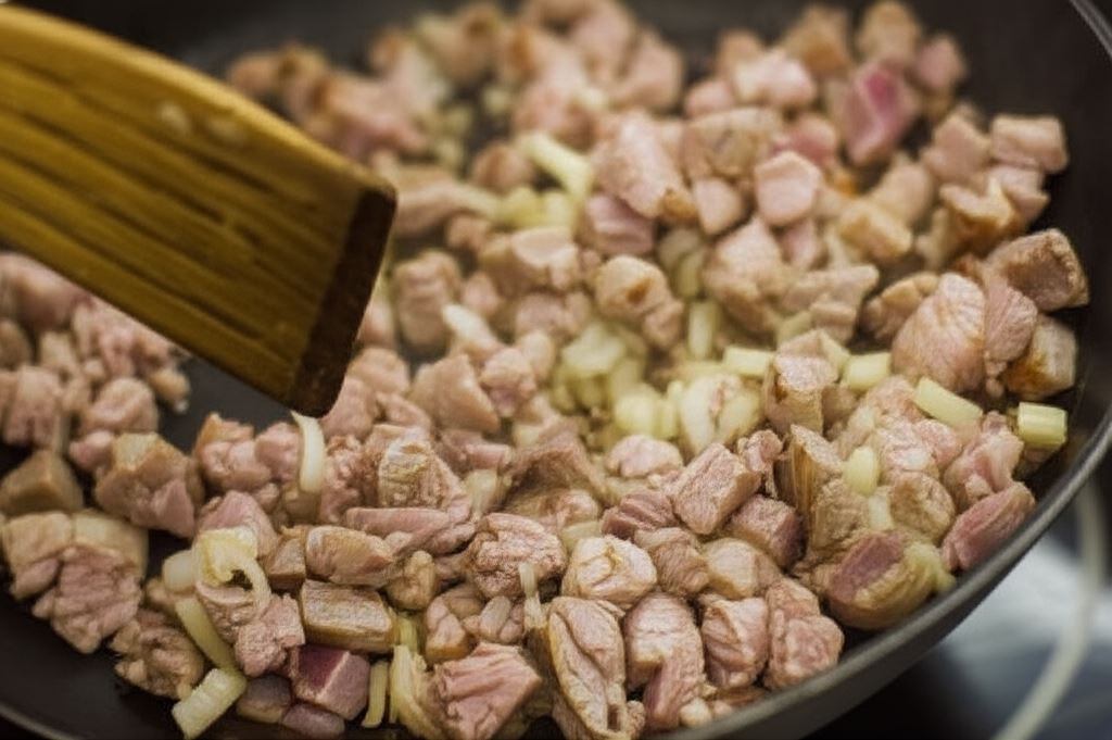Karkówkę oraz cebulę pokrój w kostkę i przysmaż na patelni.