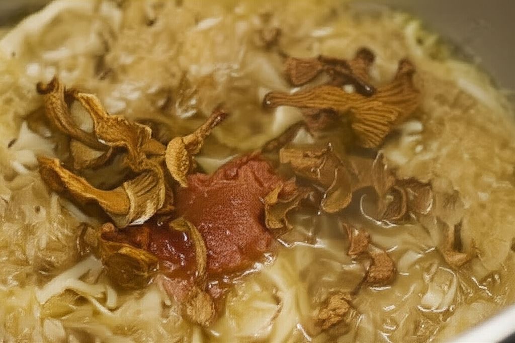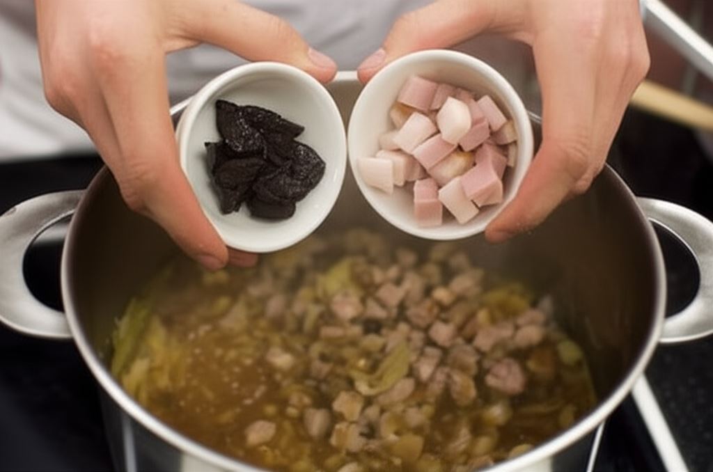 Dorzuć uprzednio moczone grzyby pocięte w kostkę i przecier. Gotuj pod pokrywką kilka minut.