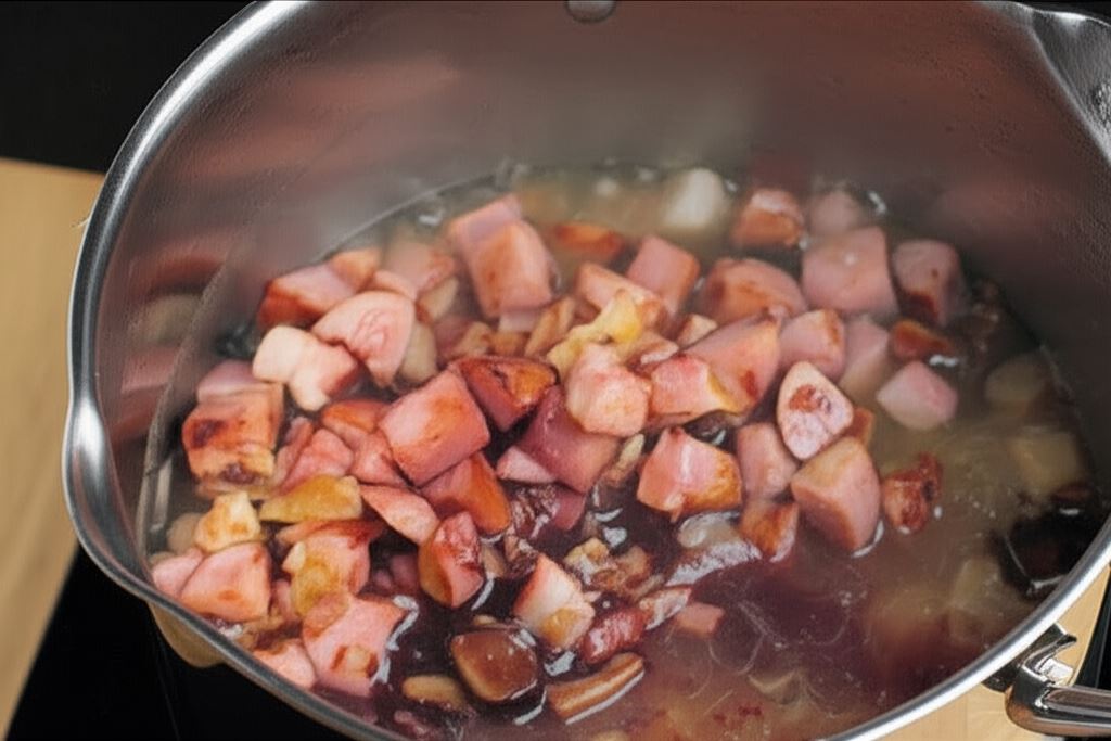Kiełbasę i boczek potnij na większe kawałki, natomiast śliwki i szalotkę na drobniejsze.