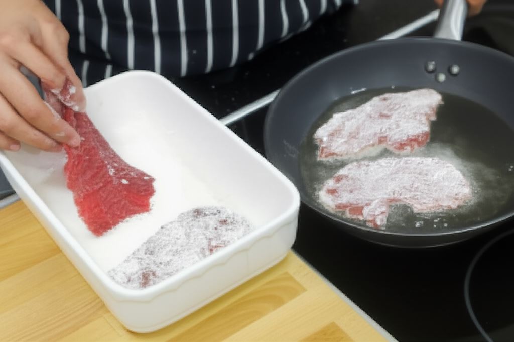Mięso potnij na plastry i ubij tłuczkiem. Potem posyp mąką i zrumień na patelni z obu stron.