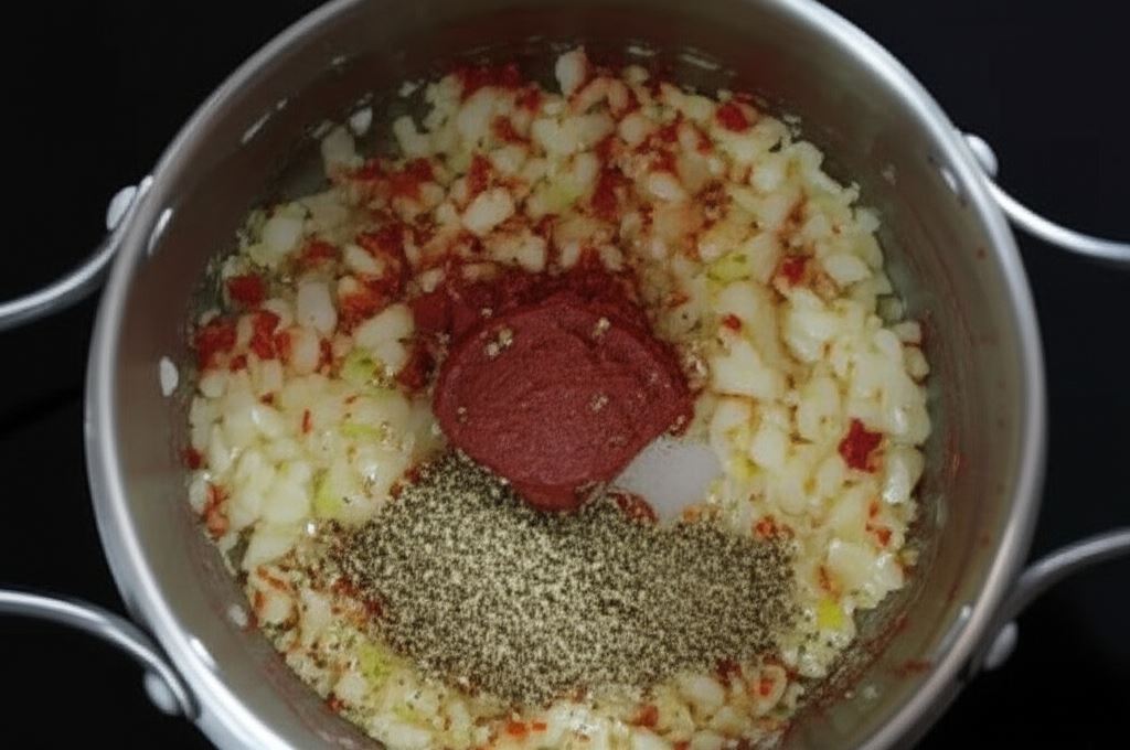 Cebulę i czosnek pokrój w kostkę i przesmaż w garnku na rozgrzanym tłuszczu do zeszklenia. Dodaj koncentrat pomidorowy oraz oregano. Smaż przez chwilę wszystko razem.
