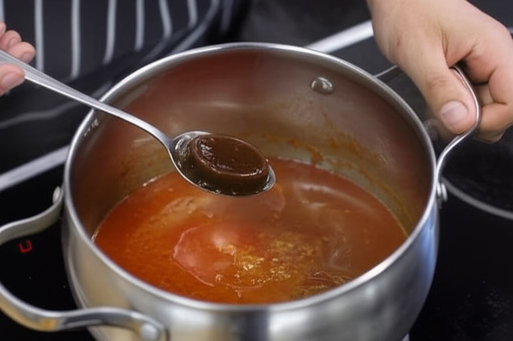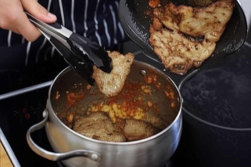 Przełóż podsmażone mięso do garnka zawierającego koncentrat pomidorowy.