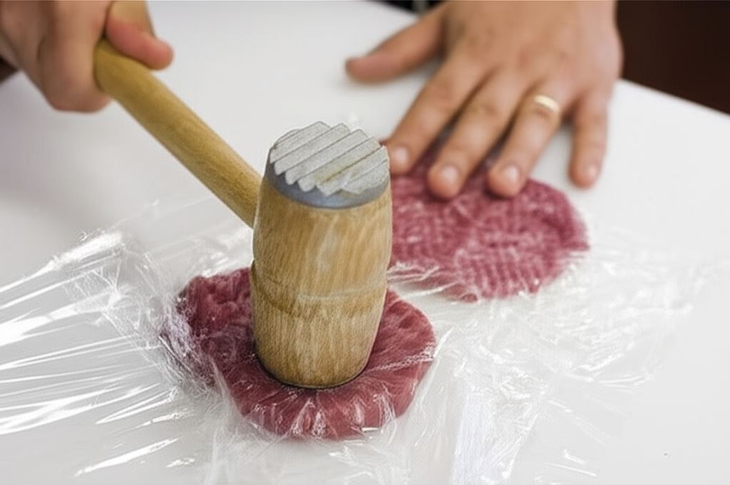 Posiekaną wołowinę delikatnie ubij, posmaruj solą, pieprzem, zmiażdżonym zielem angielskim.