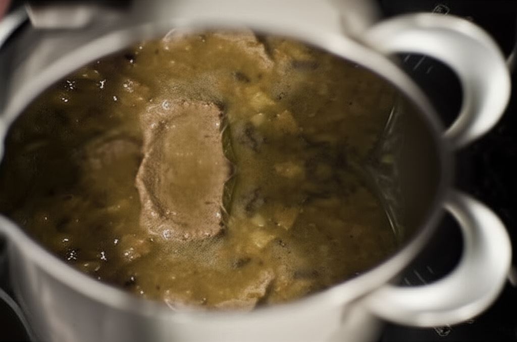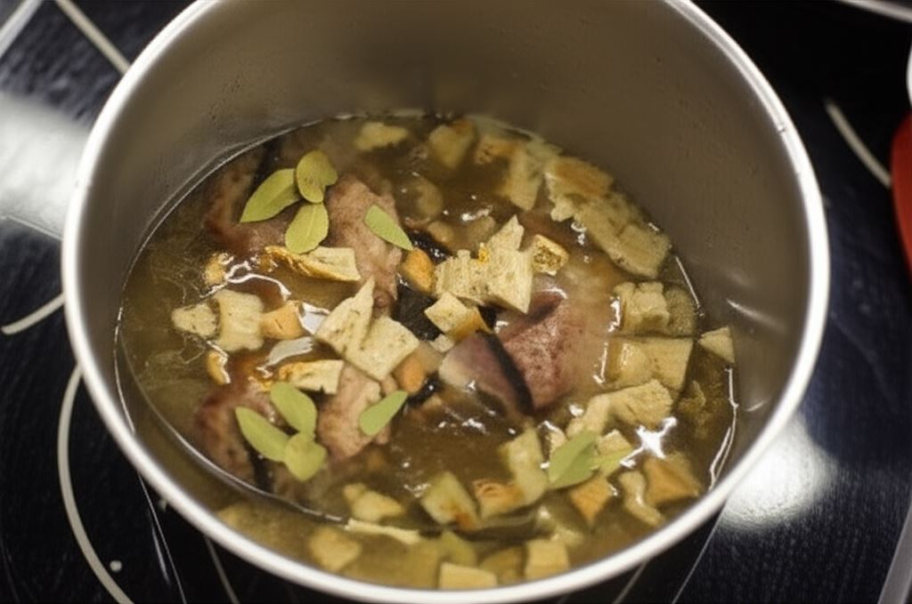 Przenieś do garnka, zalej gorącym bulionem Knorr, wrzuć liść laurowy, pokruszone kromki chleba oraz pokrojone śliwki.