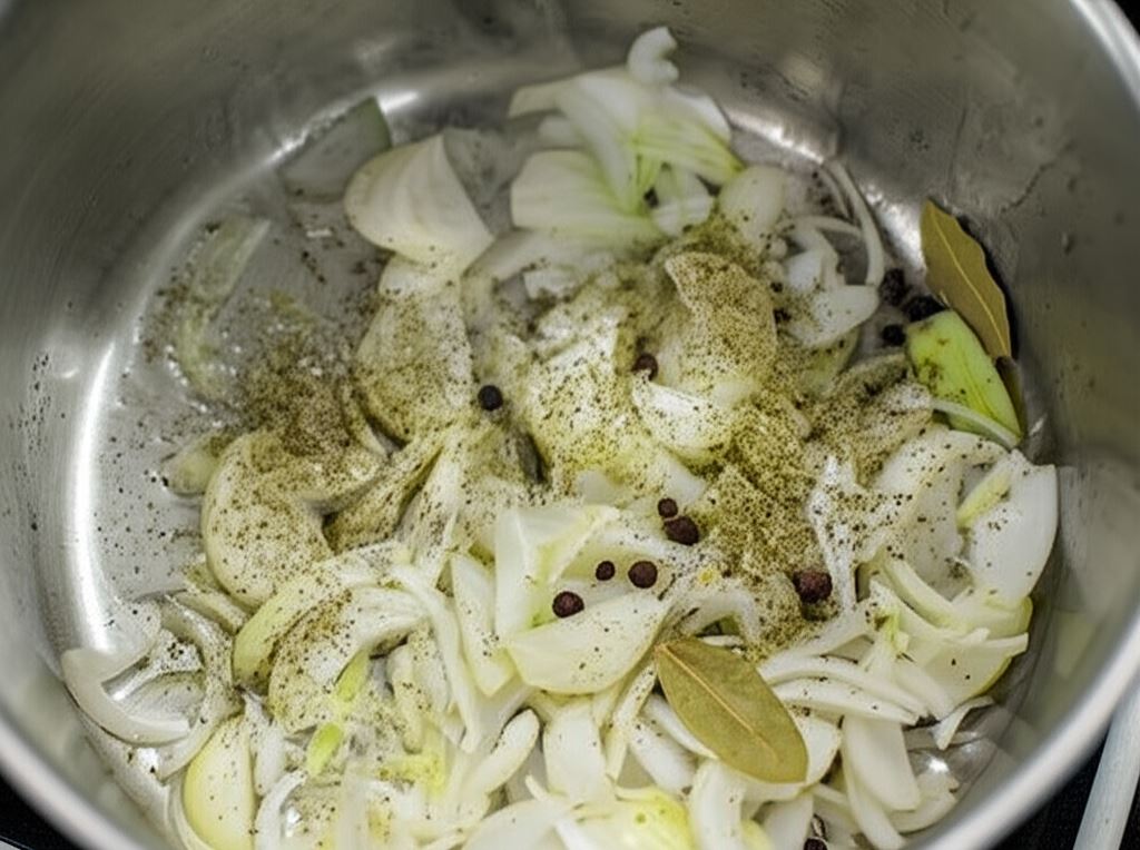 Cebulę posiekaj w piórka i zrumień w garnku. Dodaj przyprawy. Kiedy cebula uzyska złoty kolor, dodaj resztę mąki i podsmaż.