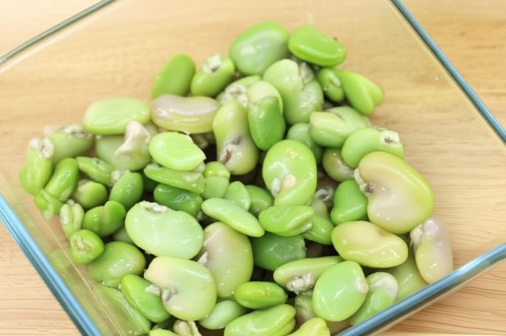 Świeży bób ugotuj i obłup. Mrożony odmroź i zdejmij skórkę.