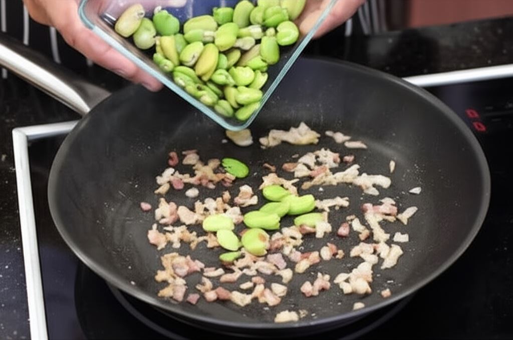 Na patelni zrumień pokrojony w kostkę boczek, wsyp bób i przez moment przesmaż razem.