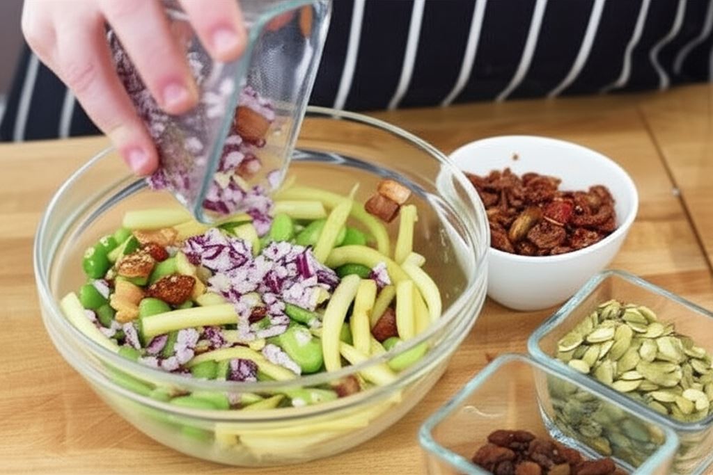Aby wydobyć pełnię smaku, wstaw gotową sałatkę do lodówki na minimum godzinę przed podaniem. Możesz też eksperymentować z dodatkami – świetnie sprawdzą się prażone orzechy włoskie, ser feta lub świeże zioła, takie jak mięta czy bazylia.