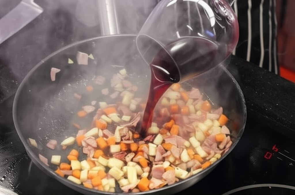 Boczek, marchew i seler pokrój w kosteczkę. Obsmaż na tej samej patelni, na której było mięso, po czym zalej 200 mililitrami czerwonego wina. Wszystko przelej do garnka z mięsem i wsyp pozostałe przyprawy oraz 200 mililitrów bulionu. Potem doprowadź do wrzenia, nakryj i umieść w nagrzanym do 180°C piekarniku.