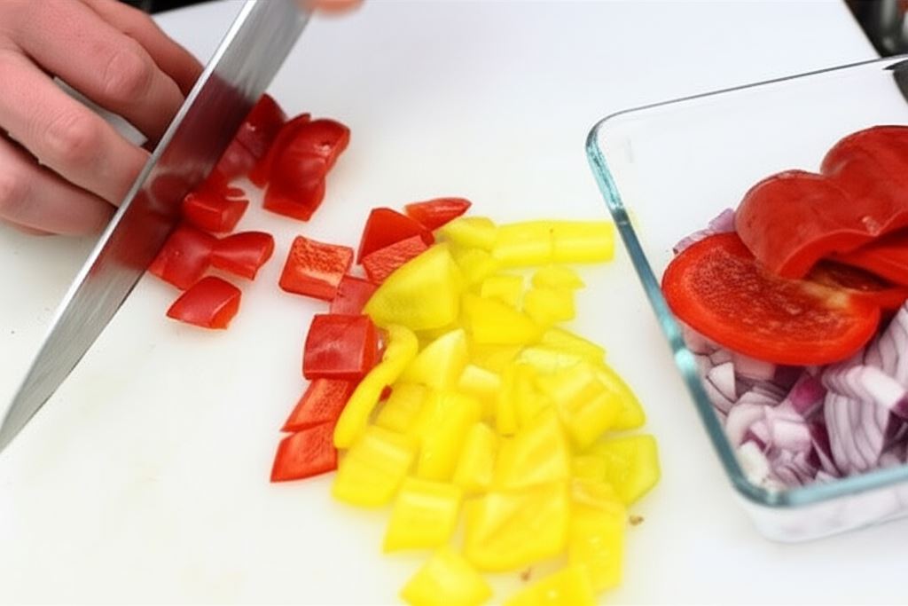 Cebulę posiekaj w kostkę, czosnek przepuść przez praskę lub drobno pokrój. Paprykę podziel na kostki o wymiarach około 1x1 cm.
