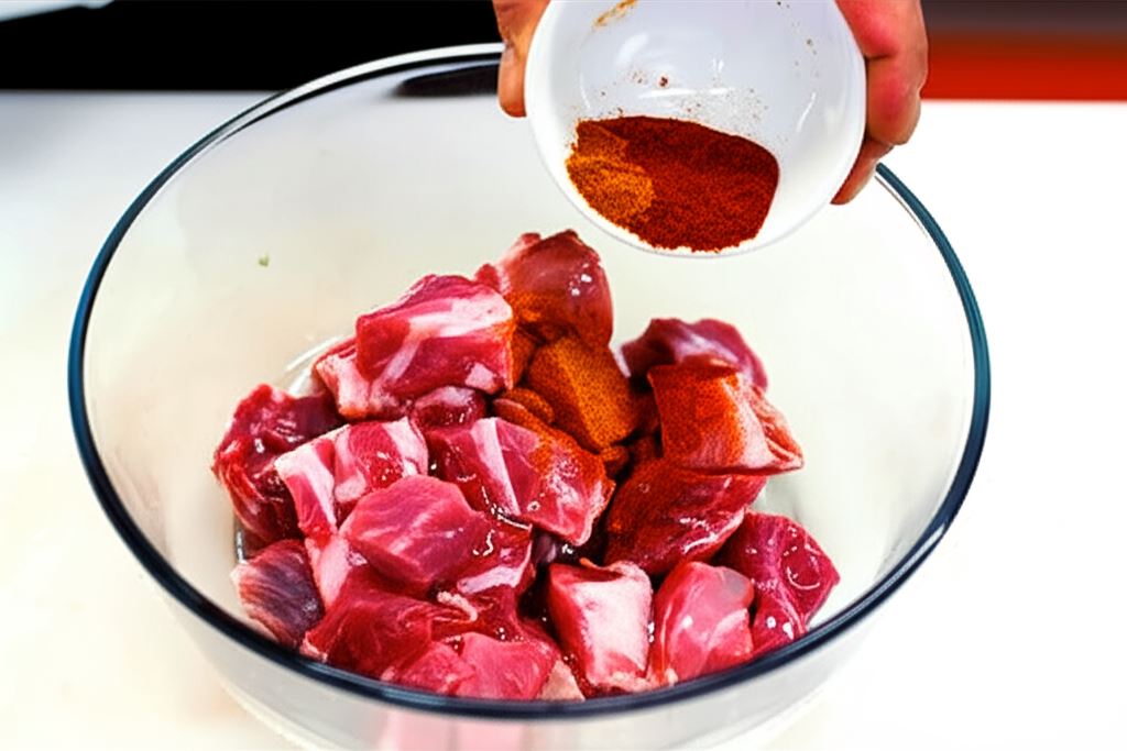 Oczyszczone mięso potnij w duże kawałki, umieść w misce i połącz z niewielką ilością oliwy oraz papryką słodką i ostrą. Pomidory zanurz na chwilę we wrzątku, zdejmij skórkę, potem przekrój na połówki i usuń nasiona.