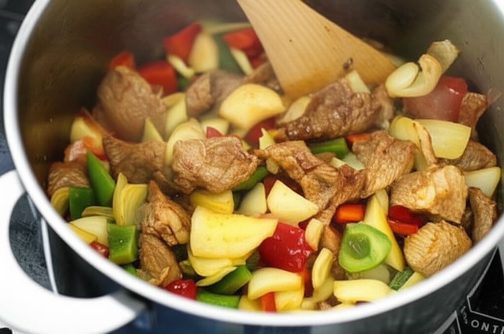 Na rozgrzanej oliwie w szerokim garnku obsmaż pokrojone mięso, wsyp cebulę, potem paprykę i pomidory.