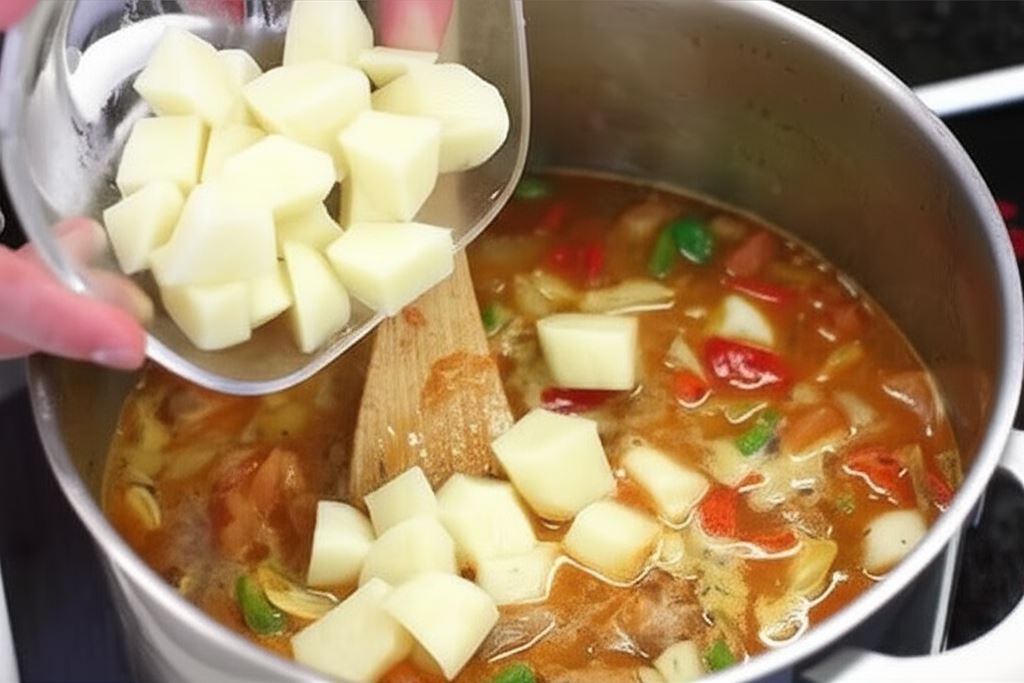 Wszystko zalej Fixem, dolej bulionu i zagotuj. Zredukuj ogień i gotuj aż mięso zmięknie. Wsyp pokrojone ziemniaki i kminek. Gotuj jeszcze przez kilka minut. Kiedy ziemniaki będą miękkie, dopraw według smaku i serwuj. Zupa powinna być podana bardzo gorąca.